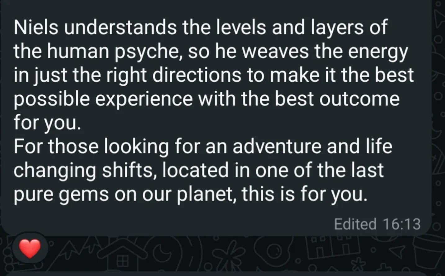 5 days of deep trance work, transformative storytelling, and guidance with angelic currents alongside Niels that releases what has been weighing on your body, mind, and spirit. This work dissolves the inner loops and unconscious patterns that have kept you stuck, so lightness, clarity, and freedom become your new normal. You leave feeling unburdened, spacious, and finally able to move through life from your true power instead of old limitations.