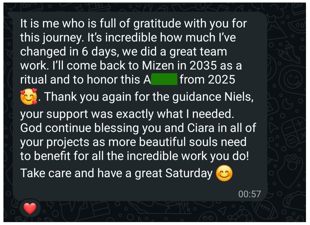 Preparation audios, stories, videos, PDFs, and exercises to deeply prepare you before you arrive, plus three months of messenger support with both Elizabeth and Niels (with weekly check-ins from Niels), a fully personalized logbook of your journey, and tailored integration resources. This means your Rite of Passage is held as a continuous process, not a single event, so you are guided both into the work and back into your life with clarity and stability. It ensures your transformation unfolds gently, coherently, and with ongoing support, instead of feeling intense and then suddenly unsupported.